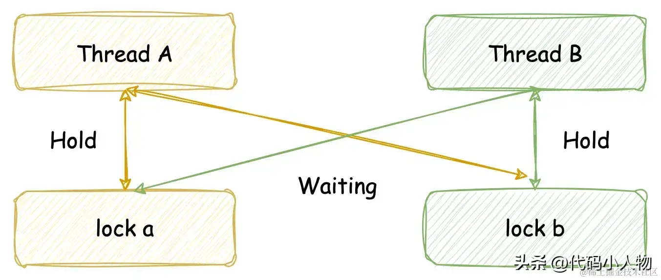 如果有一个线程A按照先锁a,后锁b的顺序获取锁,而另一个线程B按照先锁b,后锁a的顺序获取锁,就会出现如下情况: