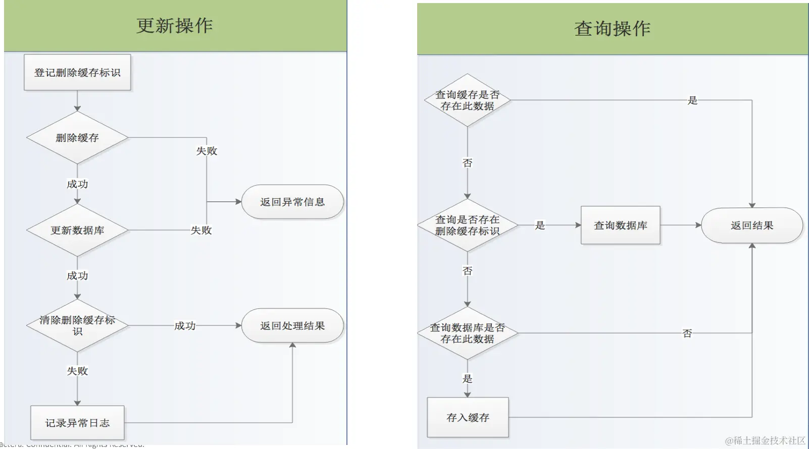 以上流程图在进行更新操作时,增加删除缓存lock,如果这会查询操作判断缓存中有数据,就直接返回数据,如果没有再次判断有没有存在删除缓存lock,如果有则走数据库查询,并返回,不放入缓存,如果没有则查询数据库,并放入缓存,并返回。