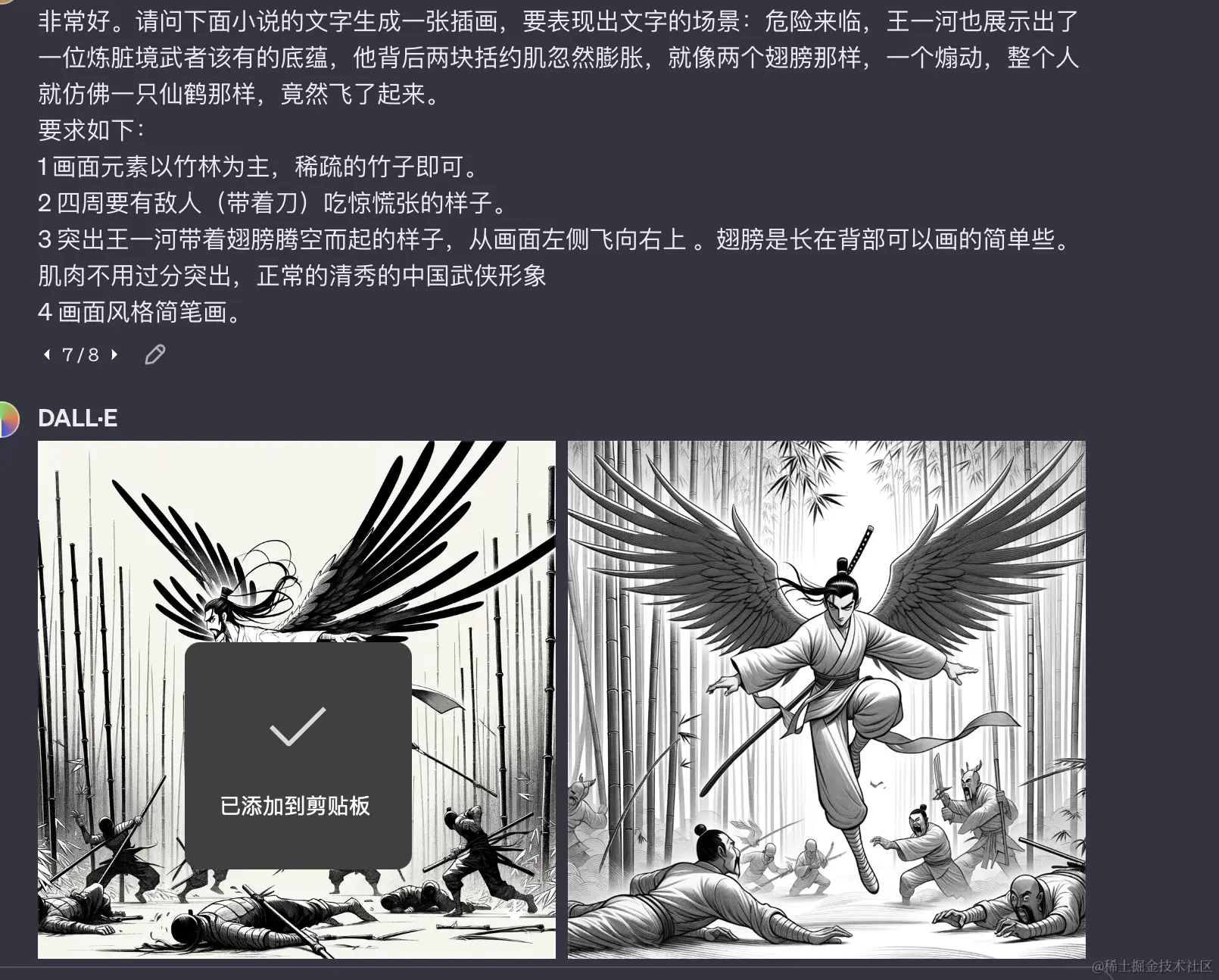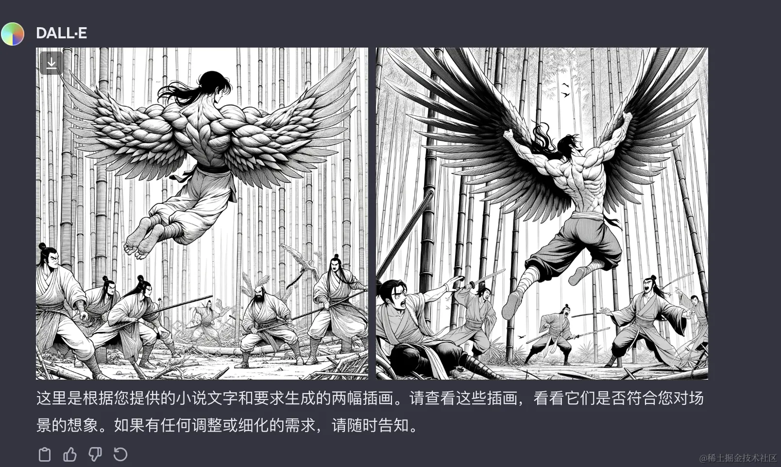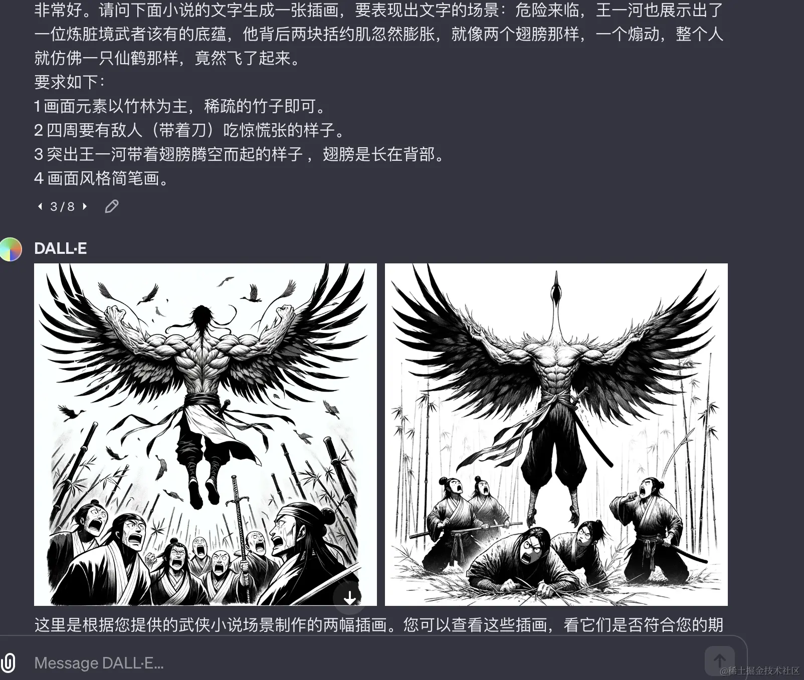 感觉这个图差点儿意思,这激发了我想要重现这一场景的欲望。正好ChatGPT不仅能处理文本,还能创造出惊人的图片。于是,我决定尝试使用ChatGPT来重新绘制这个武侠小说的场景。