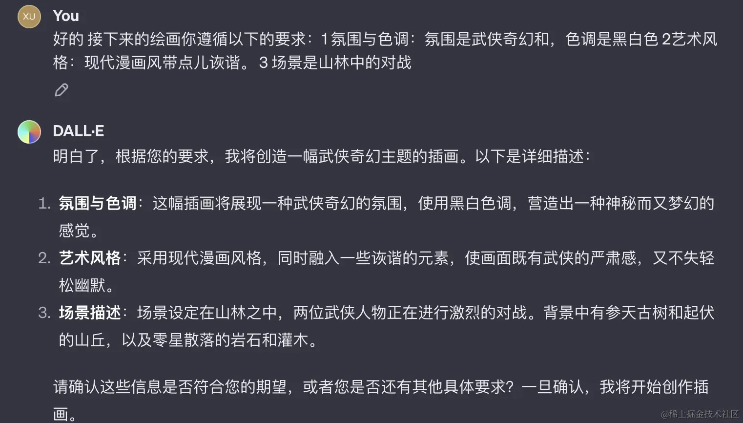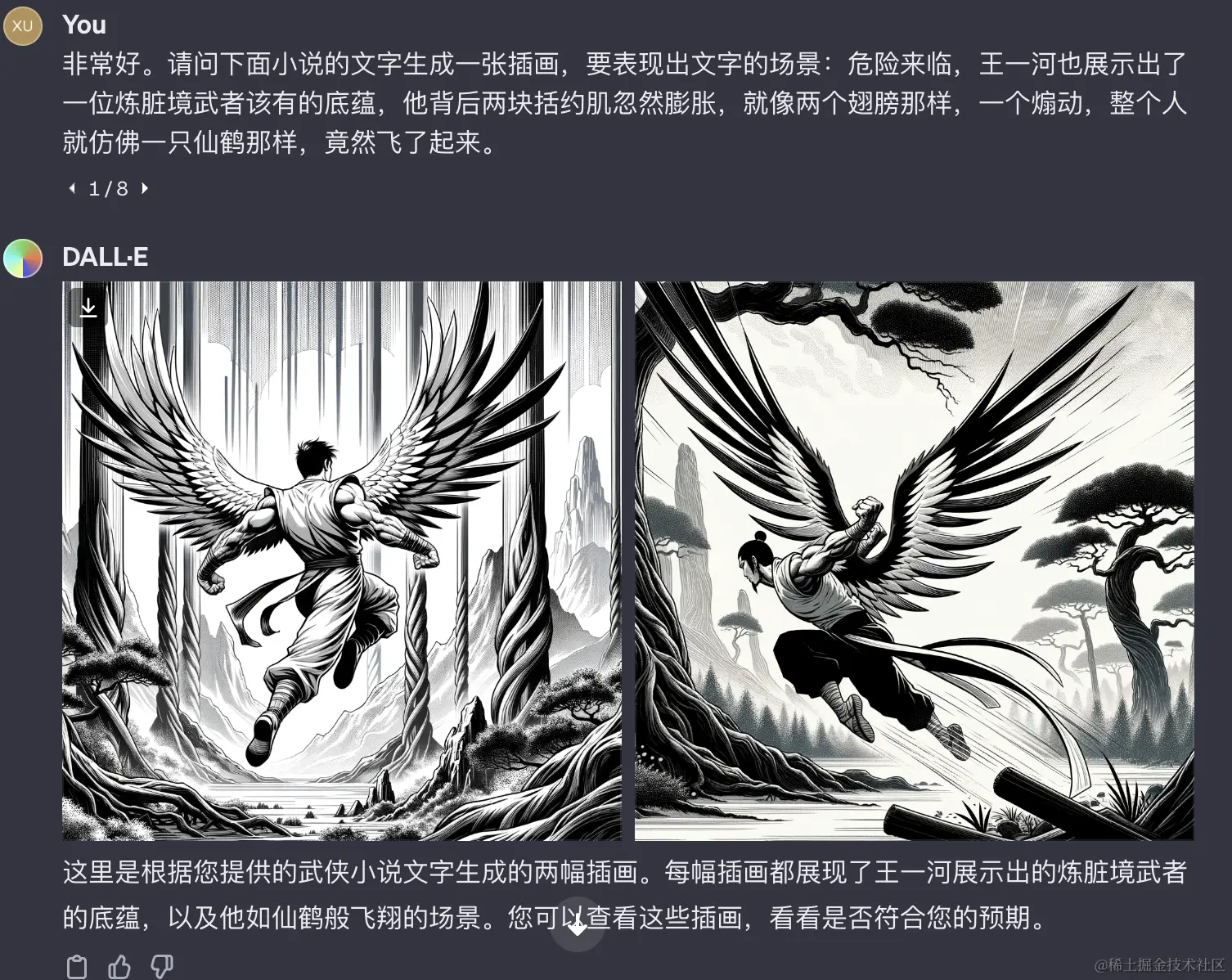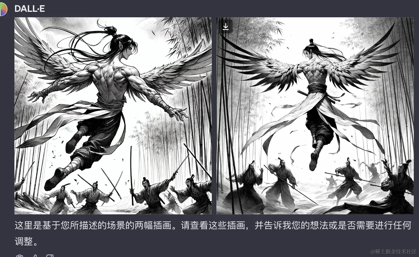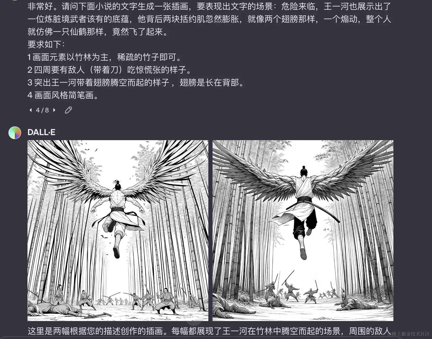 感觉这个图差点儿意思,这激发了我想要重现这一场景的欲望。正好ChatGPT不仅能处理文本,还能创造出惊人的图片。于是,我决定尝试使用ChatGPT来重新绘制这个武侠小说的场景。