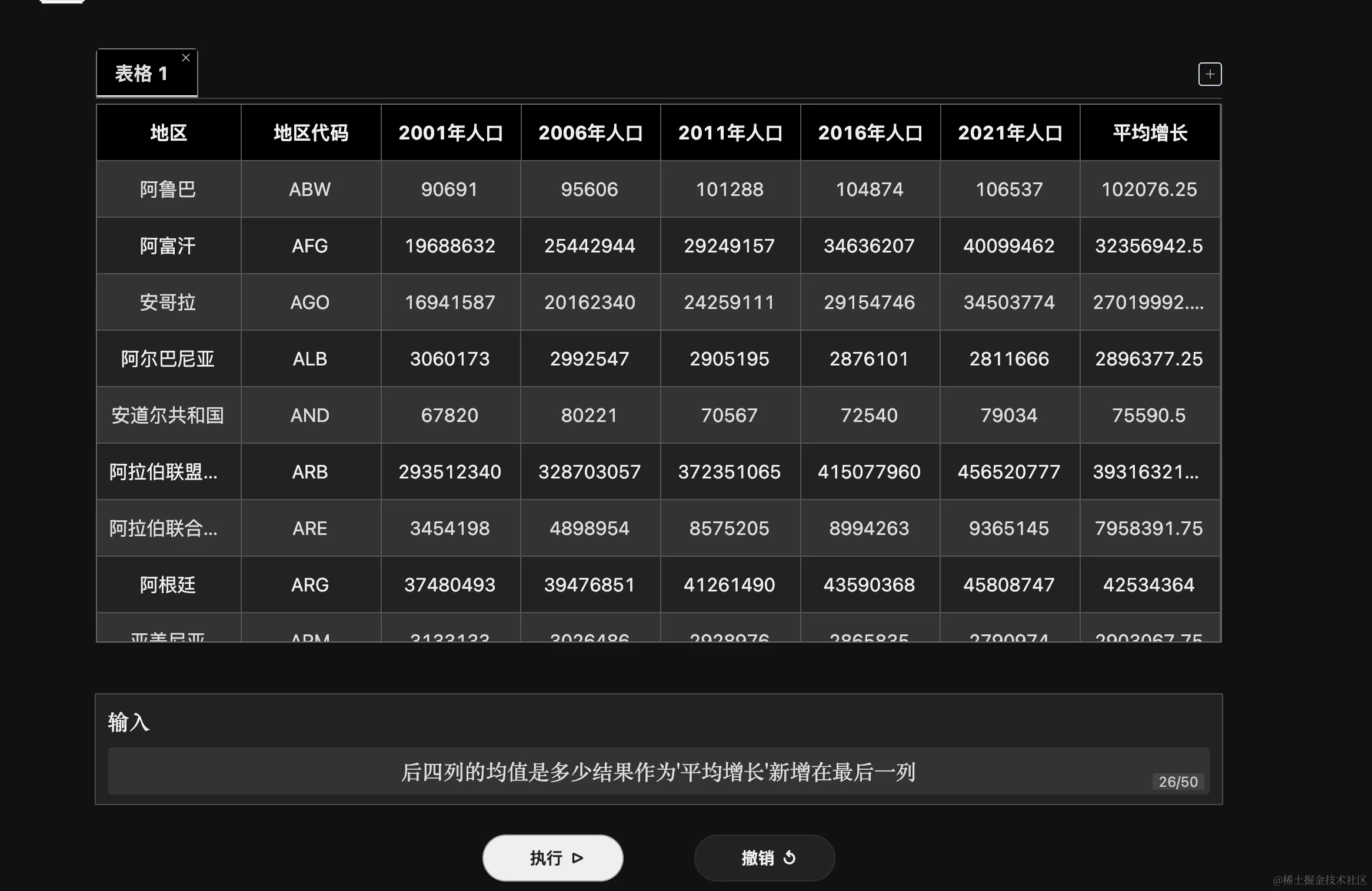 以上表格的后四列的均值是多少结果作为'平均增长'新增在最后一列