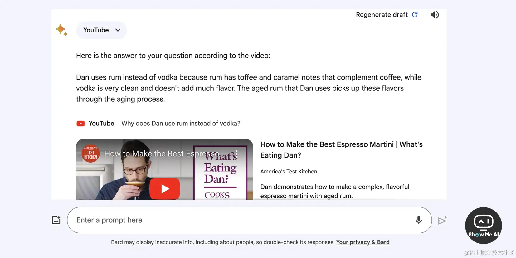 官方在介绍功能时举了一个「Espresso Martini 食谱视频」例子,展示了 Bard 可以准确地总结视频内容并回答某项食材的具体数量。