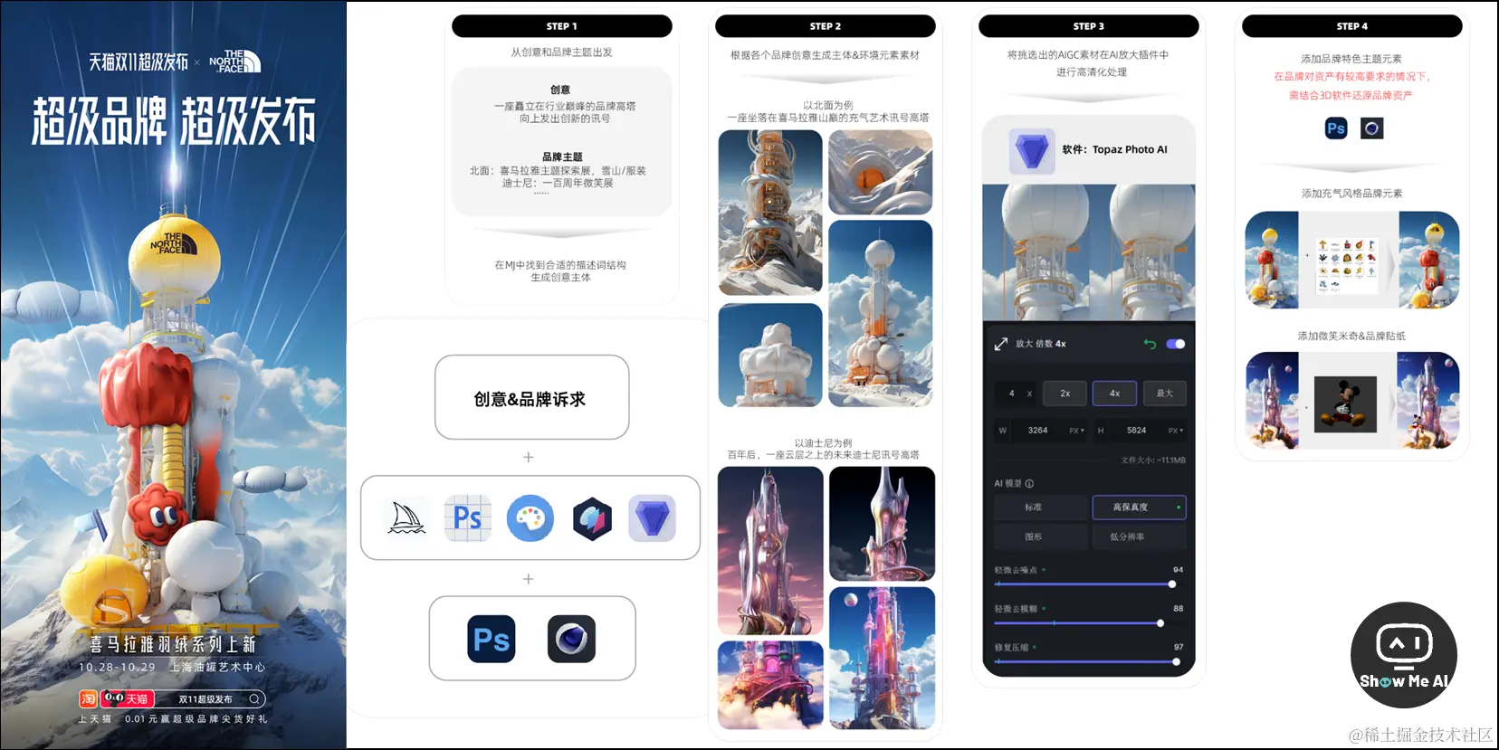 文章还通过 THE NORTH FACE 和 DISNEY 的案例,展示了设计师如何利用AI技术与常规设计软件相结合,实现了高效率和高精度的设计,甚至包括运用AI技术进行视觉合成、修缮细节等操作。