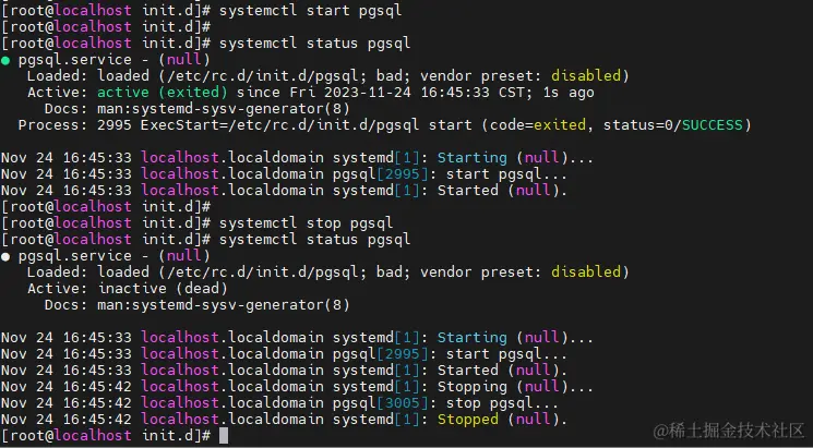 可以利用systemctl执行start和stop来查看该状态,其执行结果如下: