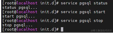 该脚本存储的路径为: /etc/init.d/pgsql ,将会获取脚本的第一个参数,而后根据判断进行相应的输出语句,编写完毕后,我们可以立即使用service进行查看,例如: