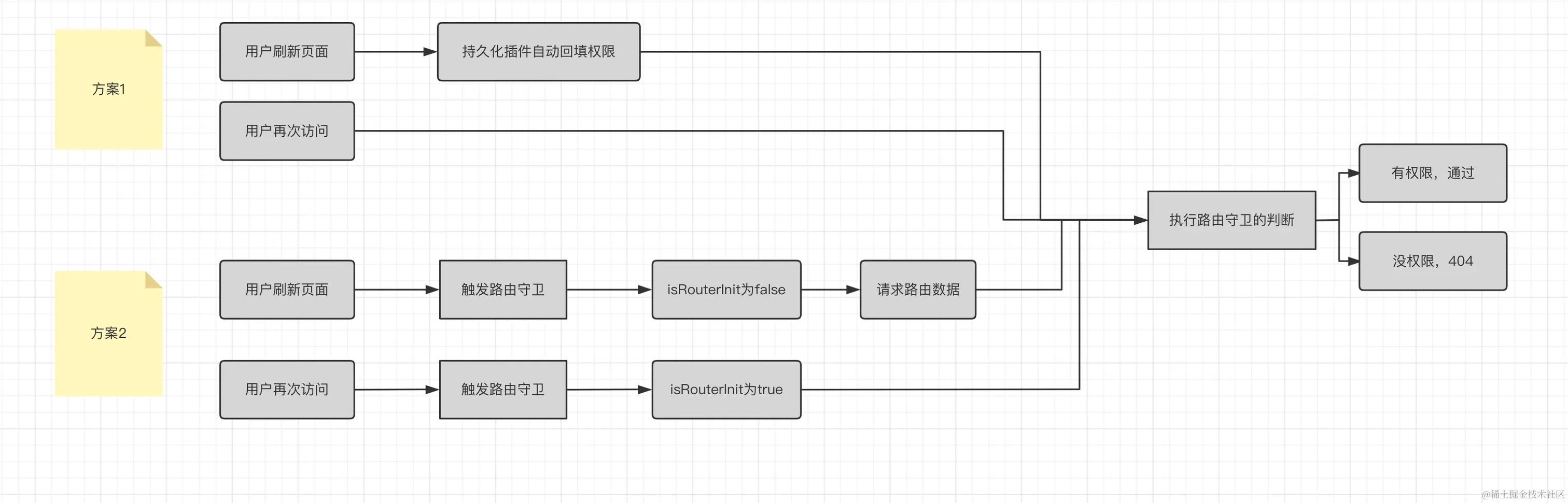 方案2(更加安全) :在pinia中创建一个变量isRouterInit标识权限是否已经被初始化,如果没获取过权限数据,则为false,如果获取过则为true;每次beforeEach的时候,登录情况下都判断该值是否为false,如果为false,则请求当前角色的权限数据,并在请求完毕后,再进行相关路由拦截逻辑,并将变量isRouterInit改为true,表明权限已经被初始化。