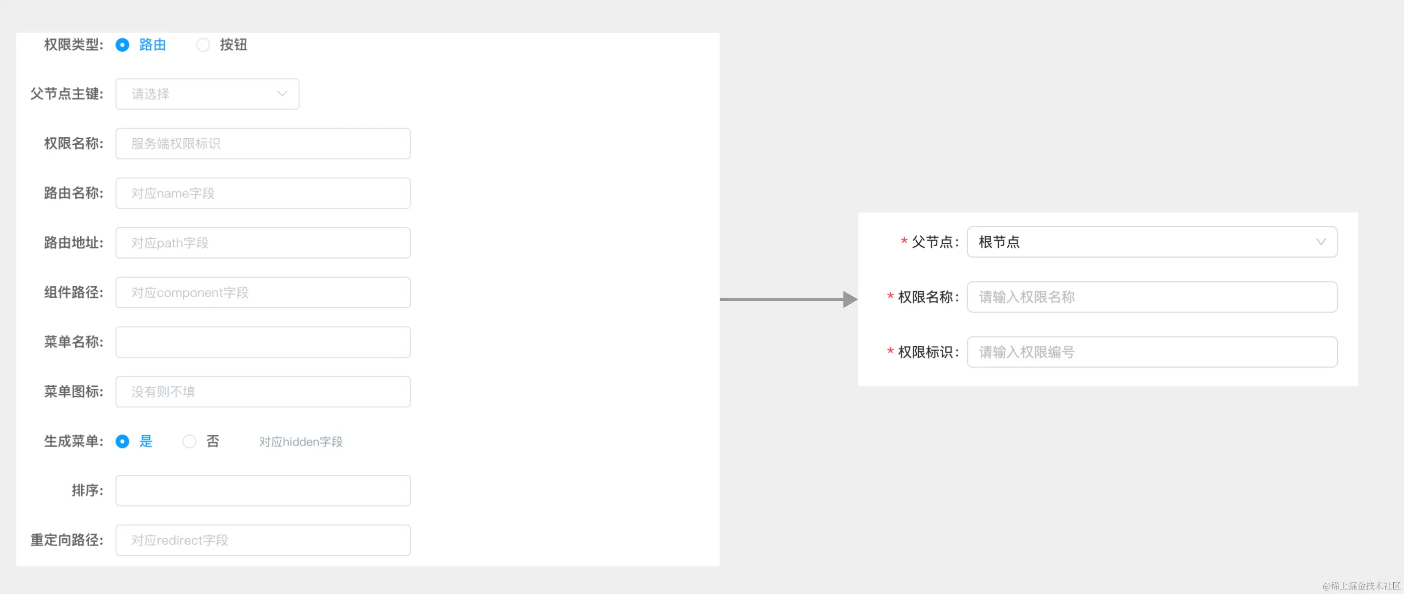 通过以上分析,我们首先可以明确一点,动态路由的配置数据还是需要放在前端项目中,而不是将路由的配置录入到系统中。所以,我们可以简化系统后台的权限配置,由之前的超多字段简化为两个字段 路由名称、路由标识,仅服务于为角色勾选路由,路由配置交还给前端项目。