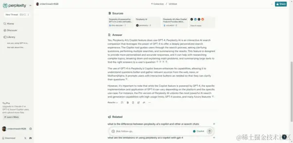 作为一款极具有前途的人工智能工具,Perplexity.ai也可以免费调用GPT-4。虽然免费版的Perplexity并没有明确说明其使用的是GPT-4,但是在将其切换为“Copilot”模式后,您就可以直接使用具有“每4小时只能回答5道问题”的GPT-4了。
