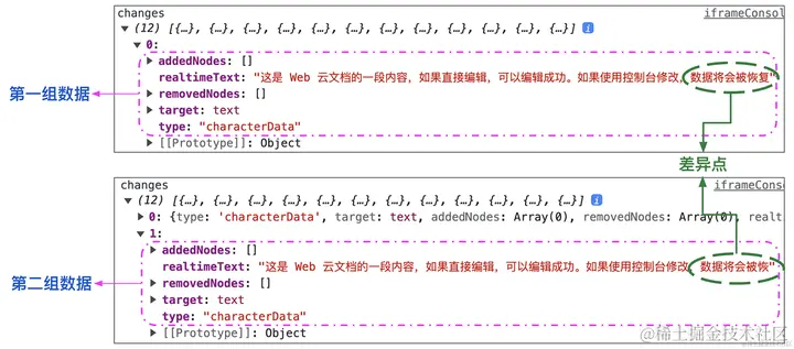两组数据唯一的变化在于 realtimeText 我们利用了这个值记录了可编辑 DOM 元素内文本值内容。
