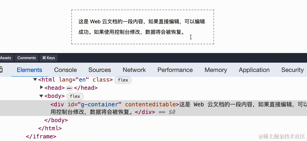 <div id="g-container" contenteditable>这是 Web 云文档的一段内容,如果直接编辑,可以编辑成功。如果使用控制台修改,数据将会被恢复。</div>