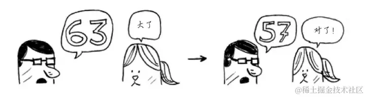 - 假设你从1开始依次往上猜,那目标值是57就一共猜了57次。