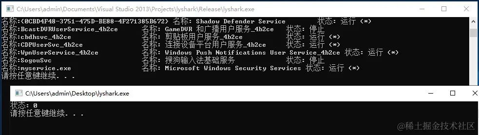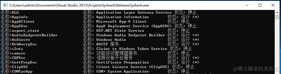 我们传入0x10则代表枚举当前系统中的独占一个进程的服务,代码需要使用管理员权限运行,输出效果图如下所示;