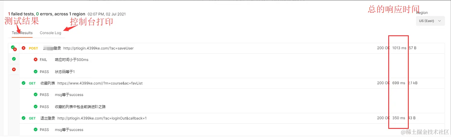 底部的TestResults和Console log可以查看具体的接口测试结果