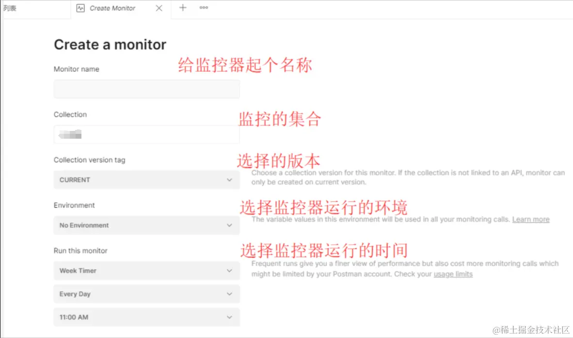 监视一个Collection: 我们选择一个集合,点击需要监控集合右侧更多按钮,点击Monitor collection,出现create a monitor界面