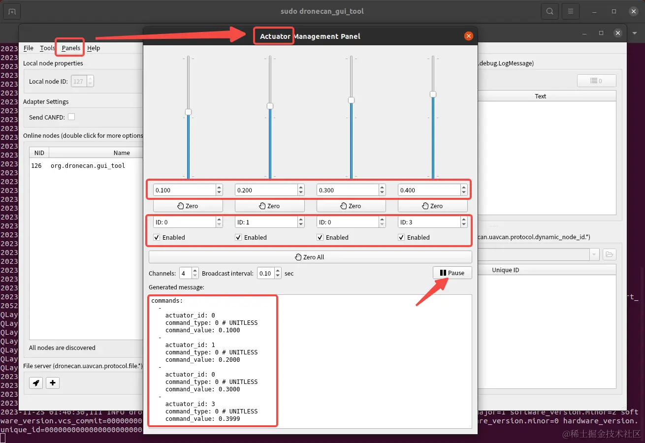 在127节点的dronecan_gui_tool主页新建一个执行器面板(actuator panel),它位于Panels -> Actuator Panel下,将其修改为我所演示的设置,具体是:value值分别为0.1、0.2、0.3、0.4,ID值分别为0、1、2、3,并且勾选四个Enabled,可以看到在Generated message中显示了完整的数据内容,如果有需要你可以点击Pause暂停数据的发送,再次点击则恢复数据的发送。