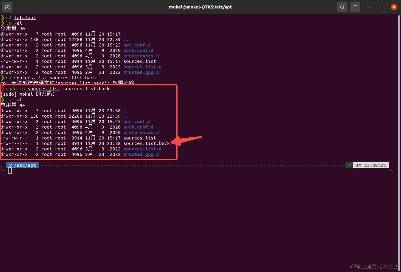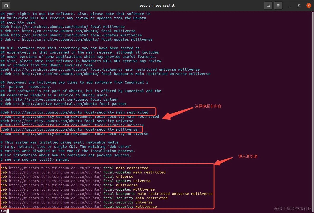 打开Ubuntu的终端,cd /etc/apt/进入文件夹下,ls -al显示文件夹的所有内容,可以看到有一个sources.list文件,通过cp sources.list sources.list.back命令将该文件备份一下,然后sudo vim sources.list打开该文件,将原有内容全部注释掉,然后将上面的清华源复制粘贴到该文件,随后:wq保存并退出该文件。