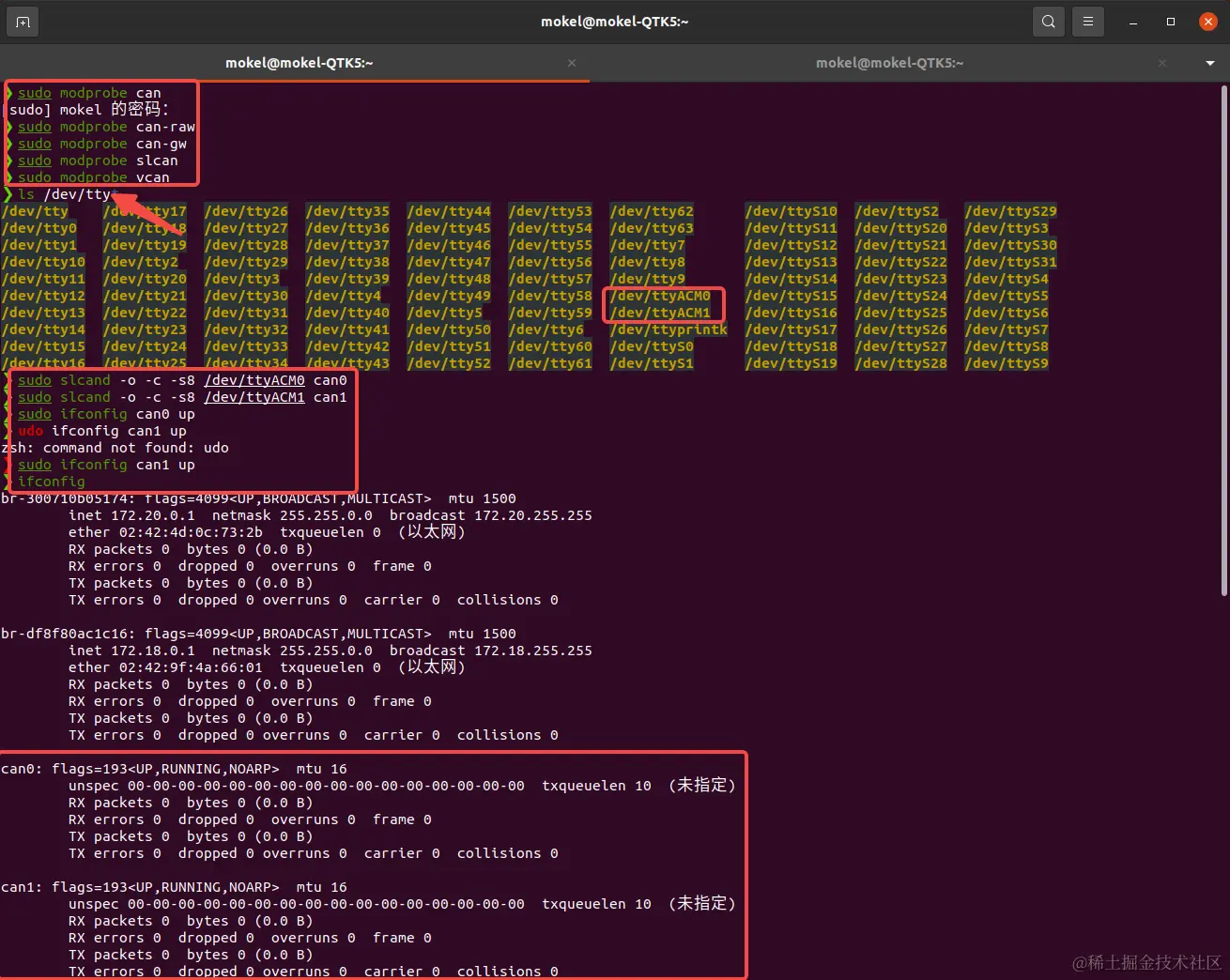 在命令行中依次执行sudo modprobe can、sudo modprobe can-raw、sudo modprobe can-gw、sudo modprobe slcan、sudo modprobe vcan完成socketCAN的相关设置,然后在命令行中执行ls /dev/tty*命令查看相关的硬件设备信息,其中/dev/ttyACM0和/dev/ttyACM1这两个设备就是连接到电脑的Pogo-DroneCAN调试器,然后在命令行中依次执行sudo slcand -o -c -s8 /dev/ttyACM0 can0、sudo slcand -o -c -s8 /dev/ttyACM1 can1、sudo ifconfig can0 up、sudo ifconfig can1 up命令来创建并启动can0和can1;在创建完成后,执行ifconfig可以看到已经有了can0和can1。