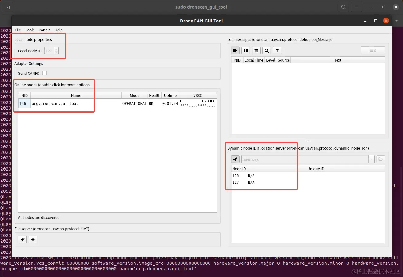 回到127节点的上位机主页面中,可以看到online nodes有126节点,右下角同样识别到了126节点和127节点,这意味着两个DroneCAN调试器都成功被上位机识别了,且两个调试器之间也成功建立了连接。