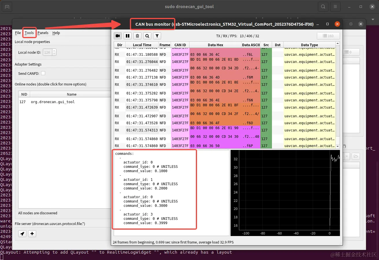 接下来,我们通过dronecan_gui_tool的工具来测试一下通过这两个DroneCAN调试器的CAN数据的收发、转换是否能够正确执行。