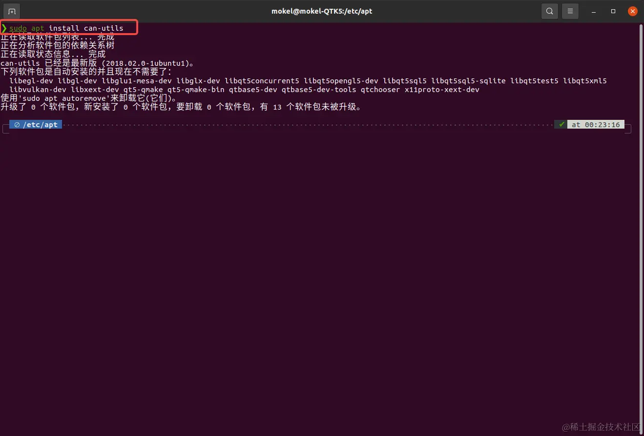 更新了sources.list文件后,依次执行sudo apt-get update和sudo apt-get upgrade命令更新下载源;更新完成后,在命令行中执行sudo apt install can-utils命令下载can-utils工具集,我们将使用该工具集来与linux下的socketCAN交互,由于我已经安装过了can-utils工具集,所以这里提示已经是最新版了。