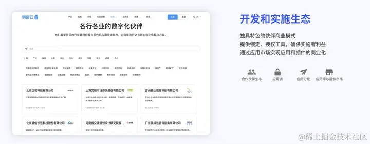 明道云结合商业战略发展了配套的产品能力。合作伙伴可以利用明道云的应用交换和应用分发能力为客户企业提供应用增值服务。我们还为应用实施者提供了锁定,授权等工具,使得实施者可以妥善保护自己的利益。同时,基于插件架构,我们也为开发者提供了市场交换能力,通过应用市场来商业化自己的应用和插件成果。
