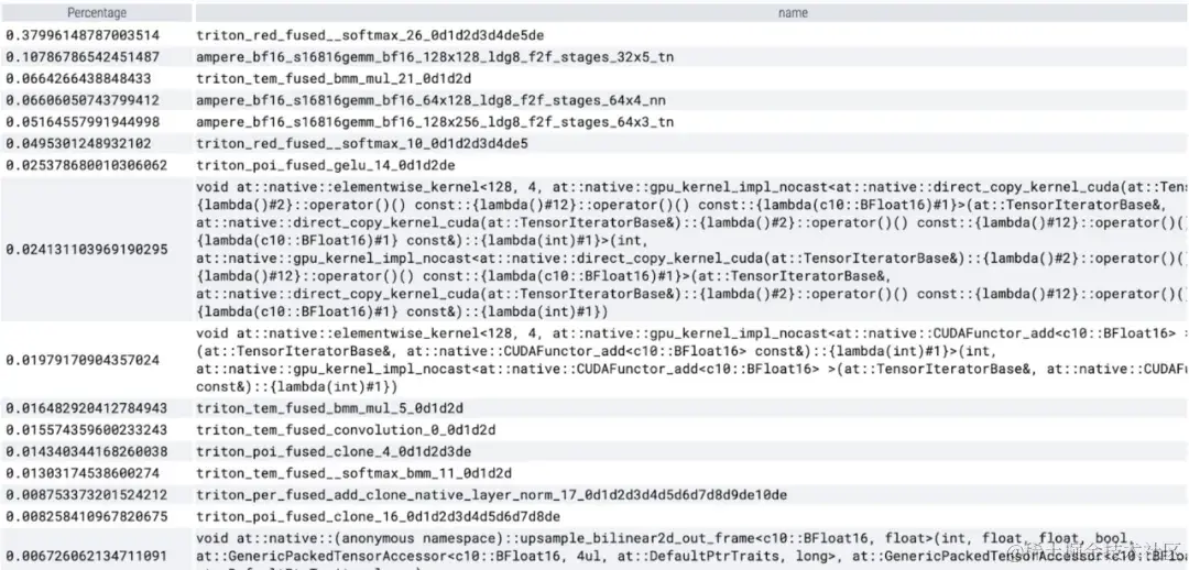 该研究表示,本文利用的 SAM 基线数据类型为 float32 dtype、batch 大小为 1,使用 PyTorch Profiler 查看内核跟踪的结果如下: