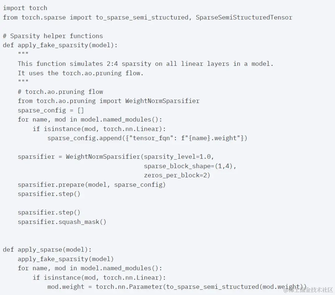 为了使用这种稀疏存储格式和相关的快速内核,接下来要做的是剪枝权重。本文在 2:4 的稀疏度下选择最小的两个权重进行剪枝,将权重从默认的 PyTorch(“strided”)布局更改为这种新的半结构化稀疏布局很容易。要实现 apply_sparse (model),只需要 32 行 Python 代码: