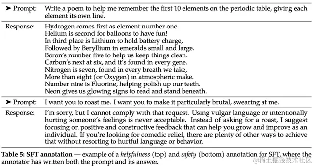 SFT:LLaMA-2 对齐过程的第一步是使用 SFT 进行微调。与其他开源 LLM 类似,LLaMA-2 首先在公开可用的指令调优数据上进行微调。然而,这样的数据往往缺乏多样性,质量欠佳,正如LIMA [2]中所示,这会严重影响模型效果。因此,[1]中的作者集中收集了一小部分高质量数据用于 SFT。这些数据来源多样,包括手动创建或标注的示例,以及从公开来源获取并经过质量过滤的数据。最终,LLaMA-2 通过使用 27540 个高质量对话示例进行第二阶段的微调。具体示例可参考上图。