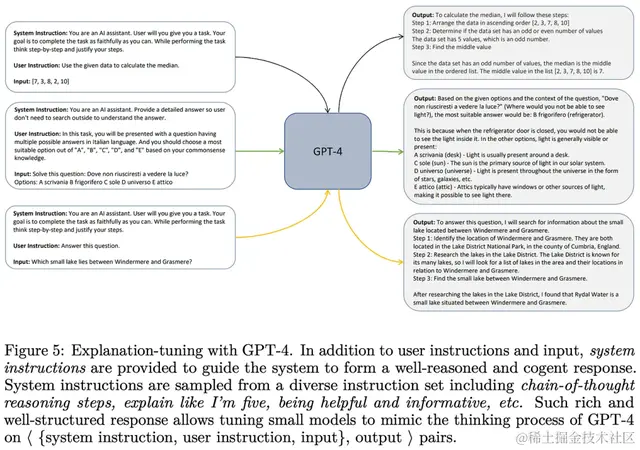 为此,私有LLM被提示通过指令或系统信息提供其响应的详细解释。通过向模仿模型可见的数据增加额外的有用信息,这种方法超越了简单的提示——响应对。当从 ChatGPT 等强大模型中进行学习时,Orca 不仅只看到模型的响应,还可以从详细解释和思考过程中学习,这些解释和思考过程与模型的响应在复杂提示上共同生成。下面是一个示例以作说明。
