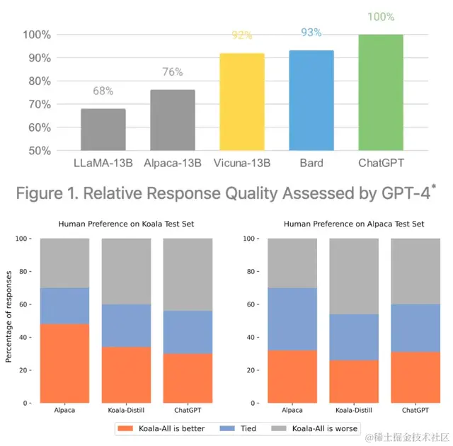 模仿的影响。这些模仿模型相继发布,并声称其质量可与 ChatGPT 和 GPT-4 等顶级专有模型相媲美。例如,Vicuna 能达到相当于 GPT-4 模型质量的 92%,Koala 在多数情况下能达到或超过 ChatGPT 模型表现,可参考上图。上述结果表明,通过模仿学习,我们可以提取任一专有模型的能力,并将其转化为一个更小的开源 LLM 。假如情况果真如此,那么人们将能够轻松复制最优秀的专有 LLM ,从而导致专有 LLM 丧失其优势。