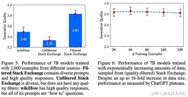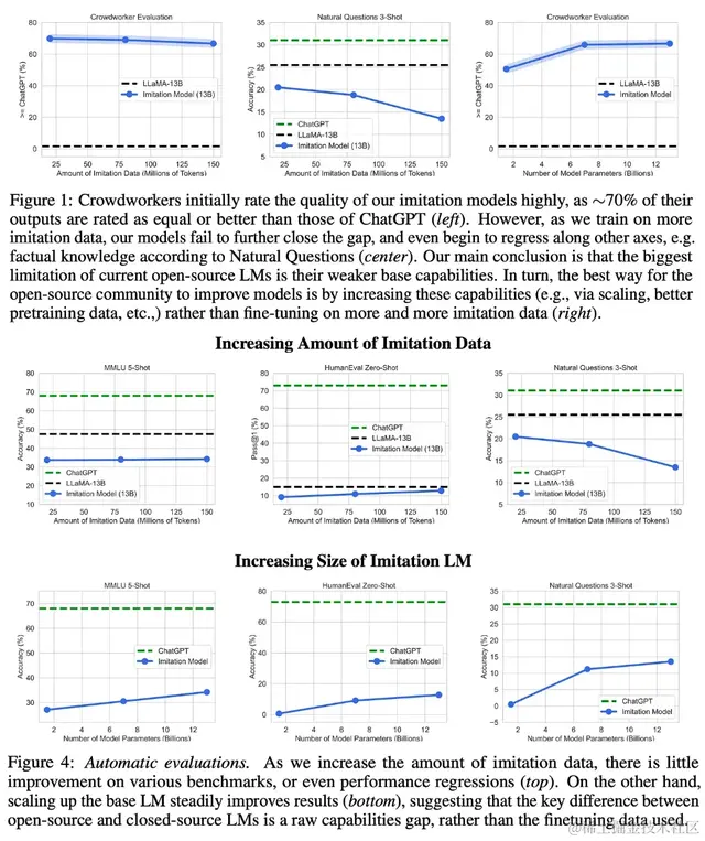 “我们得出的结论是,如果要纯粹通过模仿来广泛匹配 ChatGPT,就需要集中精力收集大量的模仿数据集,并收集比当前可用数据更加多样、质量更高的模仿数据。” ——引自[6]