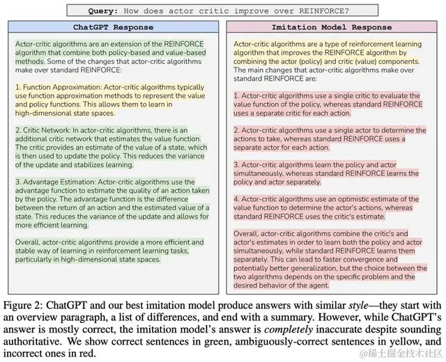 关于这一点,我们首先需要考虑:为什么这些模型的表现如此出色?在[6]中我们看到,模仿模型学会了模仿 ChatGPT 等模型的风格。因此,即使模型更频繁地生成事实错误信息(这些信息更难以进行简单的检查或验证),人类工作者仍会受蒙蔽,认为模型输出的是优质内容。