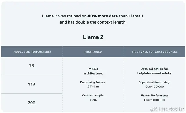 近期发布的 LLaMA-2[1] 套件由几个开源模型组成,其参数大小在 70 亿到 700 亿之间。与其前身 LLaMA-1 相比,LLaMA-2 的预训练数据要多 40%(2 万亿个词元),具有更长的上下文长度,并采用了针对快速推理进行优化的架构(分组查询注意力[4])。LLaMA-2 成为了开源模型的 SOTA。