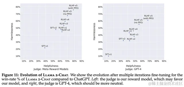 6.有趣的是,[1]中的作者采用了两种不同的 RLHF 方法,包括典型的 PPO, RLHF 变体和一种拒绝采样微调变体:i) 从模型中采样 K 个输出;ii) 选择最佳输出;iii) 在该示例上进行微调。值得注意的是,这两种方法都基于强化学习。