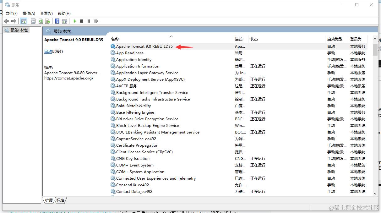 其中 REBUILD35 是服务名称,您可以自行指定,但请注意使用英文且不要包含空格或特殊字符。执行后会看到 The service 'REBUILD35' has been installed. 字样,表示添加成功。您也可以进入 Windows 服务功能中查看是否正确添加。