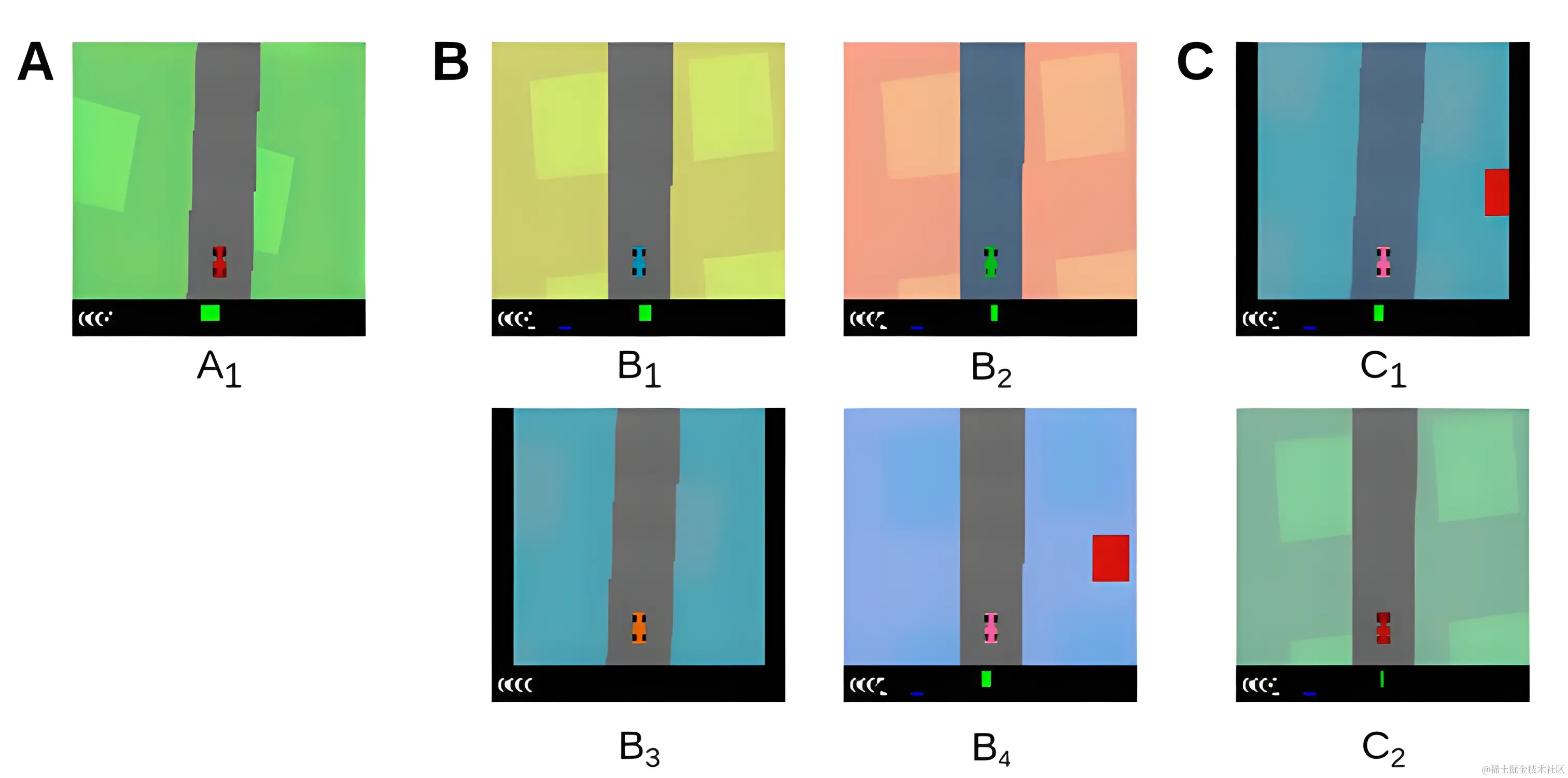 图 2 . CarRacing 游戏的变体。A . CarRacing 游戏的原始版本设置为源域。B . 收集观察状态来学习 LUSR 的 CarRacing 游戏的可见目标域。C . CarRacing 游戏的看不见的目标域。这两个域永远不会被主体观测到,不仅在强化学习训练期间,而且在潜在状态表示学习期间。