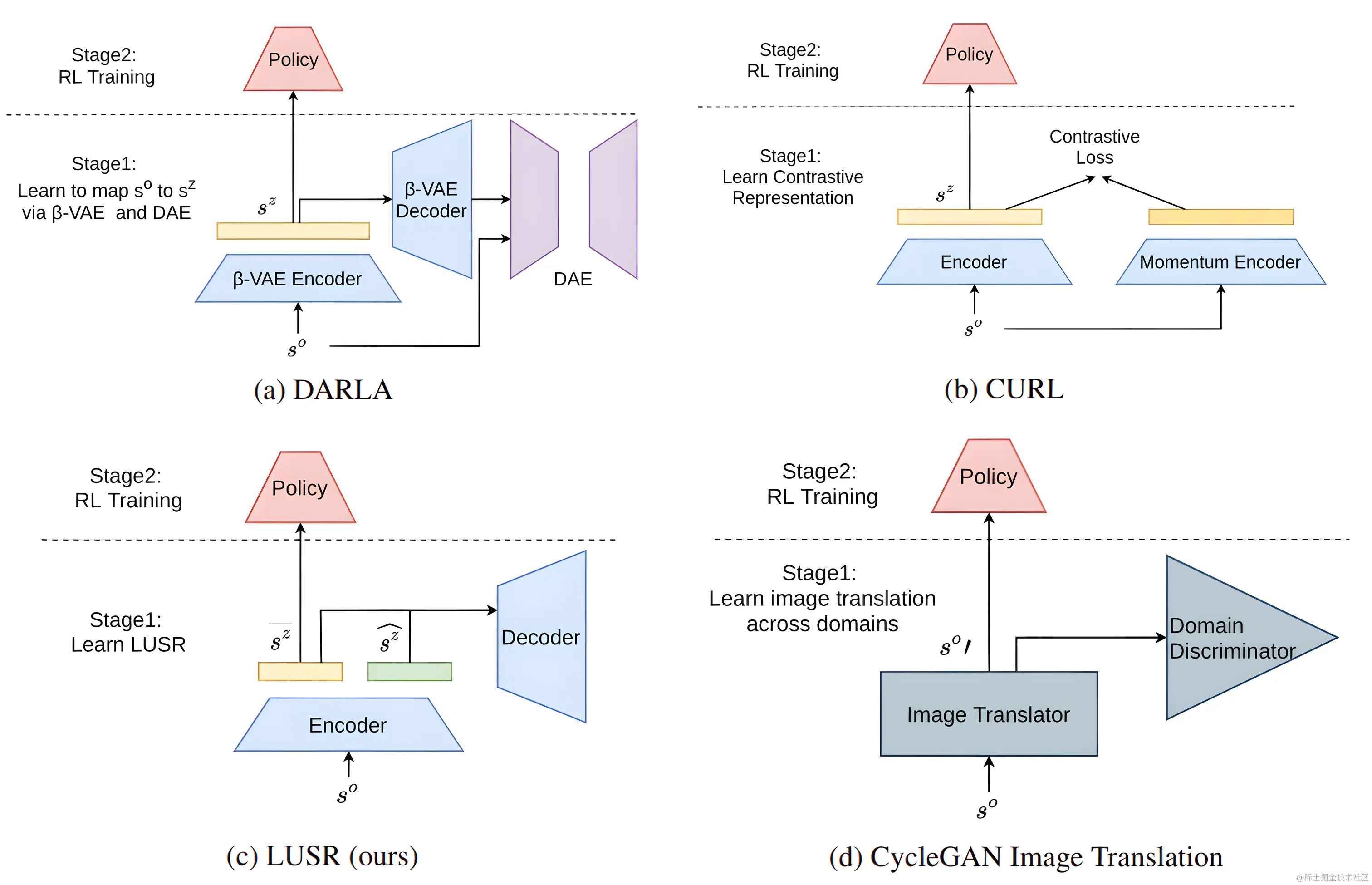 图 1 . 文中的方法 (LUSR) 和本文中用于比较的其他基准 (DARLA、CURL 和基于 CycleGAN 的图像到图像转换)的架构。VAE-嵌入的架构可以被视为 DARLA 的一个特例,它将 β \beta β -VAE 替换为 VAE,并避免使用 DAE。所有这些方法的学习可以分为两个阶段。第一阶段是学习适合支持强化学习中领域适应的状态表示,第二阶段是进行强化学习训练。