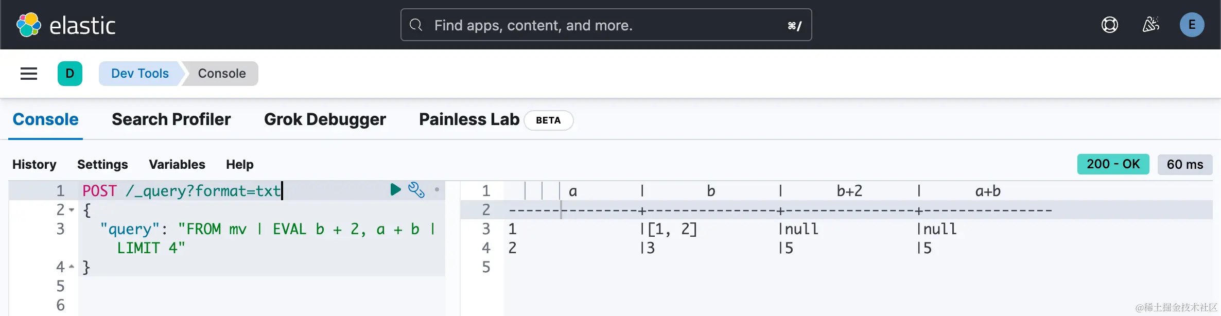 3. "query": "FROM mv | EVAL b + 2, a + b | LIMIT 4"