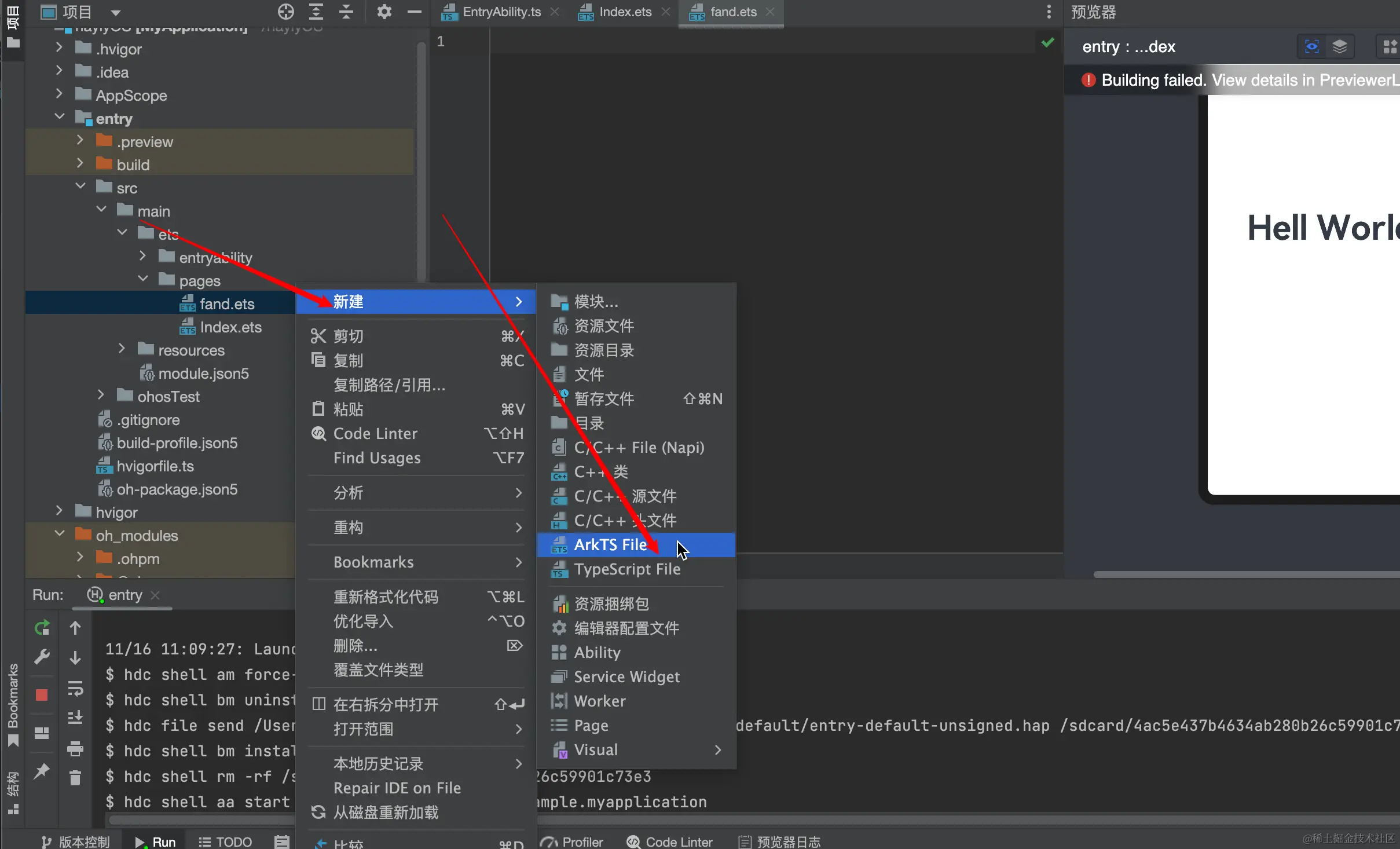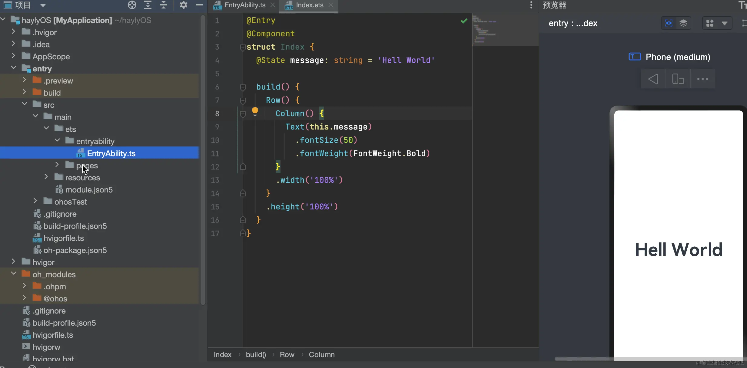 工程同步完成后,在“Project”窗口,点击“entry > src > main > ets > pages”,打开“Index.ets”文件,可以看到页面由Text组件组成。“Index.ets”文件的示例如下: