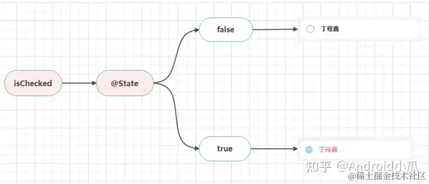 使用 @State 装饰符改变组件状态,声明式UI的特点就是UI是随数据更改而自动刷新的,我们这里定义了一个类型为 boolean 的变量 isChecked,其被 @State 装饰后,框架内建立了数据和视图之间的绑定,其值的改变影响UI的显示。