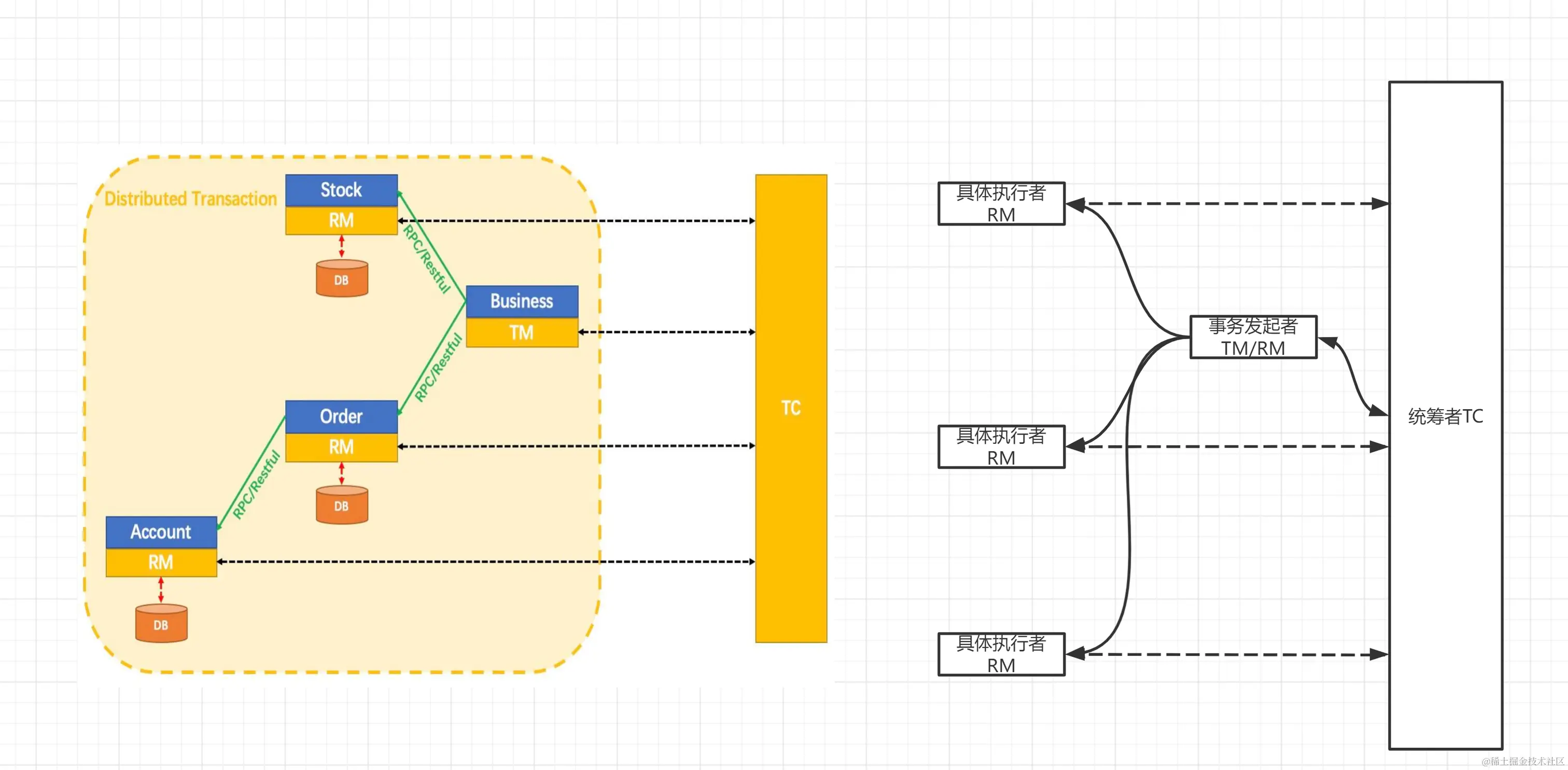 - TM:事务管理器,负责协调和管理事务,事务管理器控制着全局事务,管理实务生命周期,并协调各个RM。全局事务是指分布式事务处理环境中,需要操作多个数据库共同完成一个工作,这个工作即是一个全局事务。