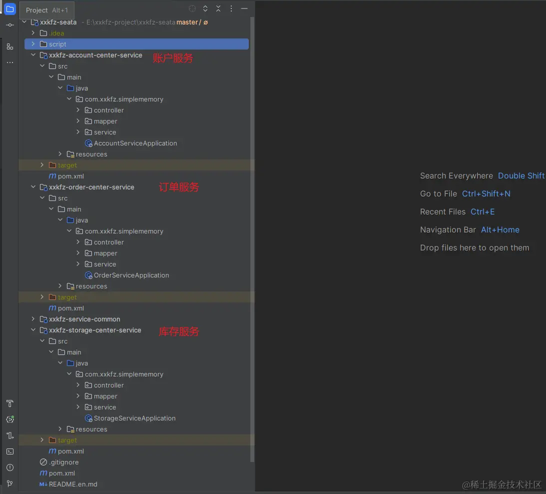 在我们的微服务系统中,对应业务被对应的拆分成独立模块,在官方提供的架构图中,我们可以看出当前是三个服务分别是: