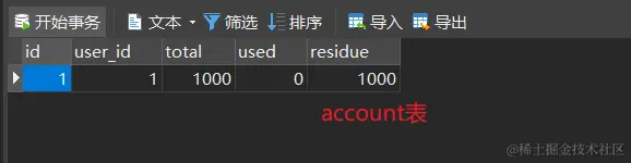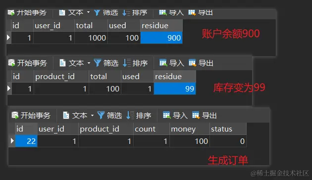 当前用户userId = 1 的账户为1000,库存100,模拟用户购买商品1个,消费100,业务调用后,数据库数据状态应该如下:
