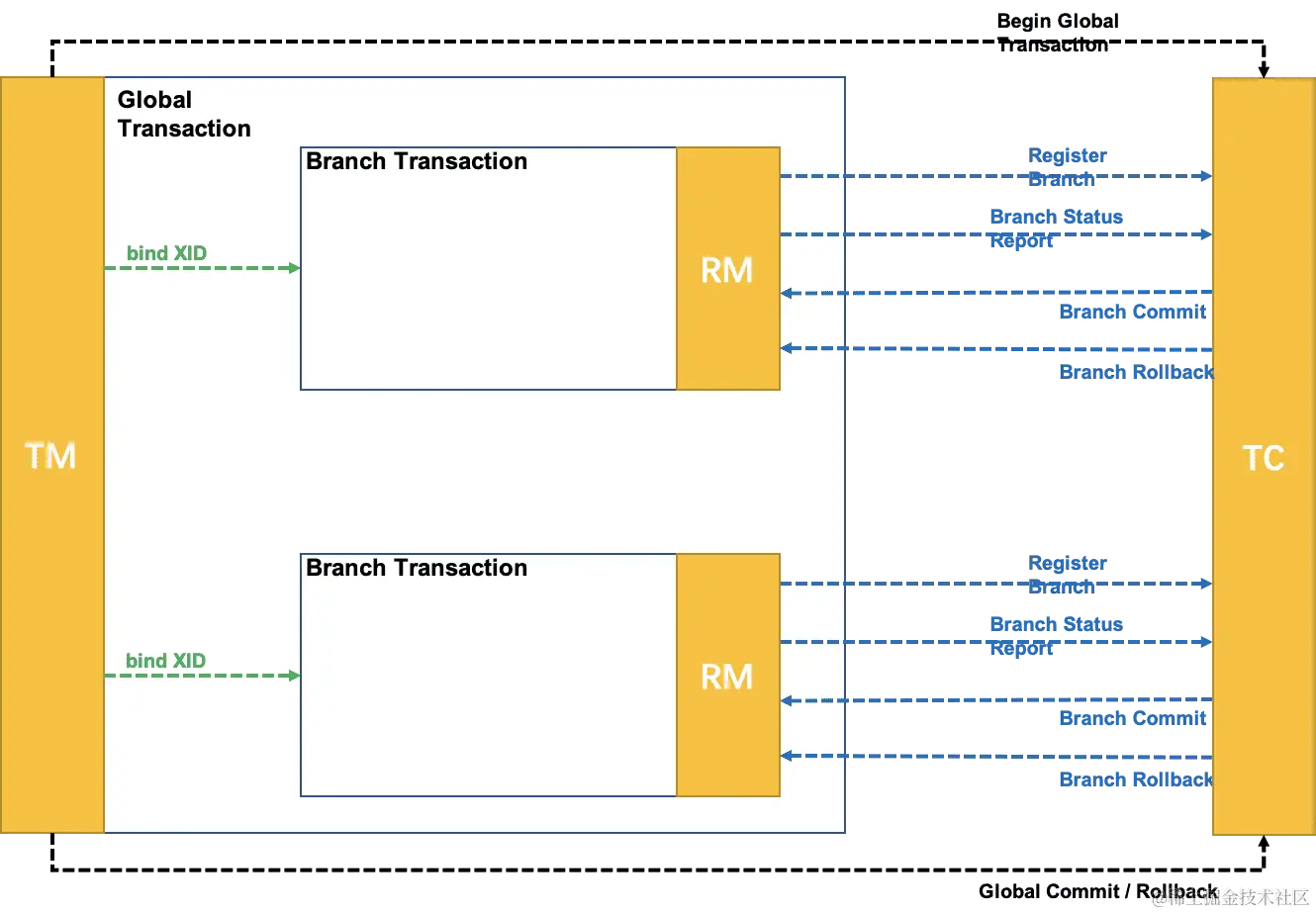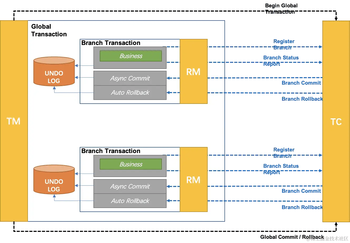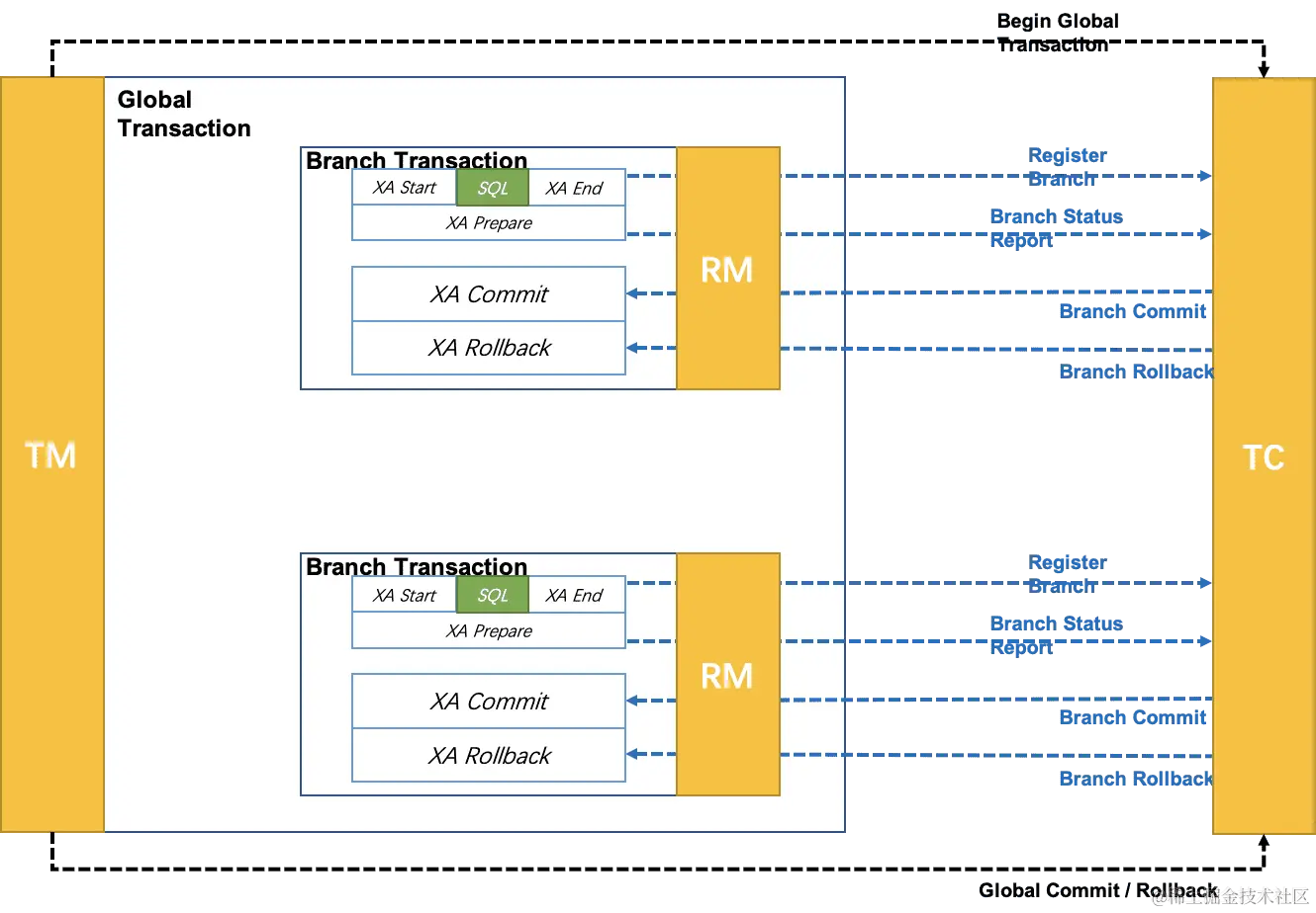 - RM:资源管理器,可以理解为事务的参与者,一般情况下是指一个数据库的实例(MySql),通过资源管理器对该数据库进行控制,资源管理器控制着分支事务