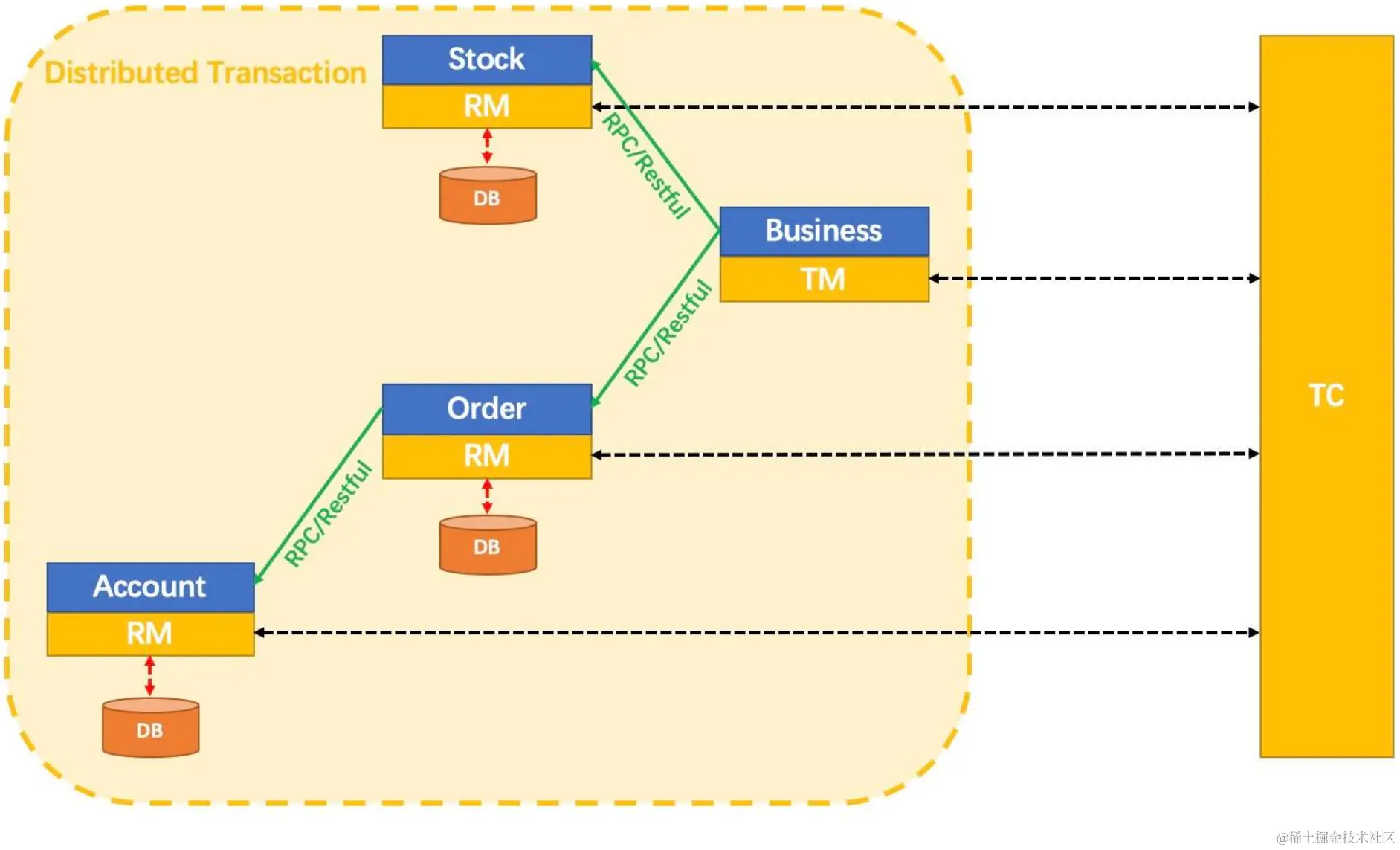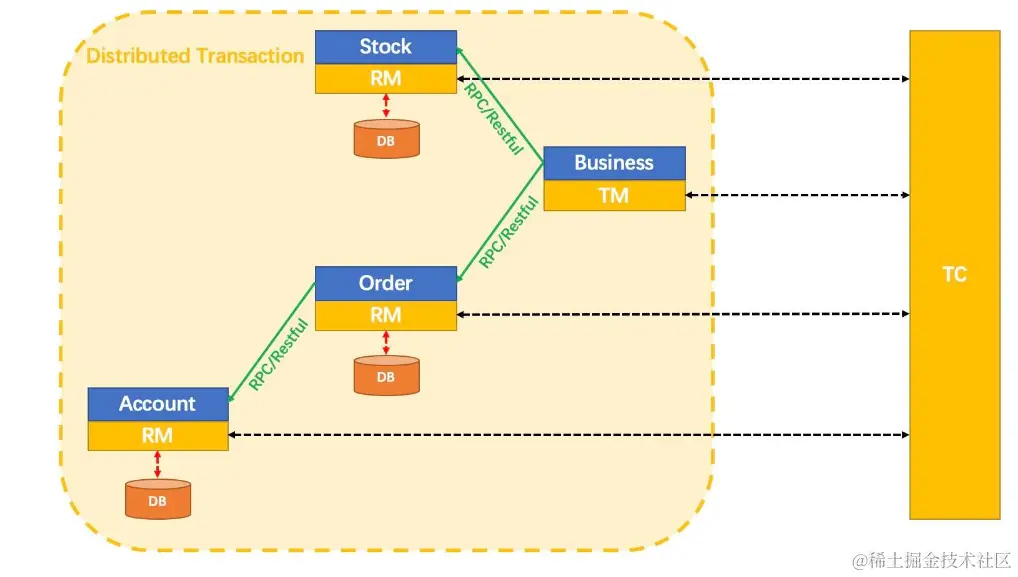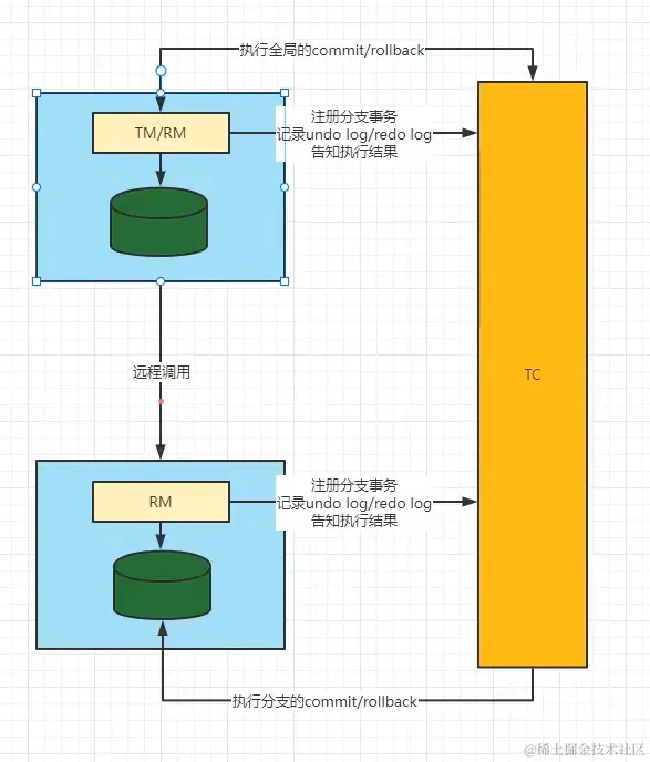 TC (Transaction Coordinator) - 事务协调者;维护全局和分支事务的状态,驱动全局事务提交或回滚。
