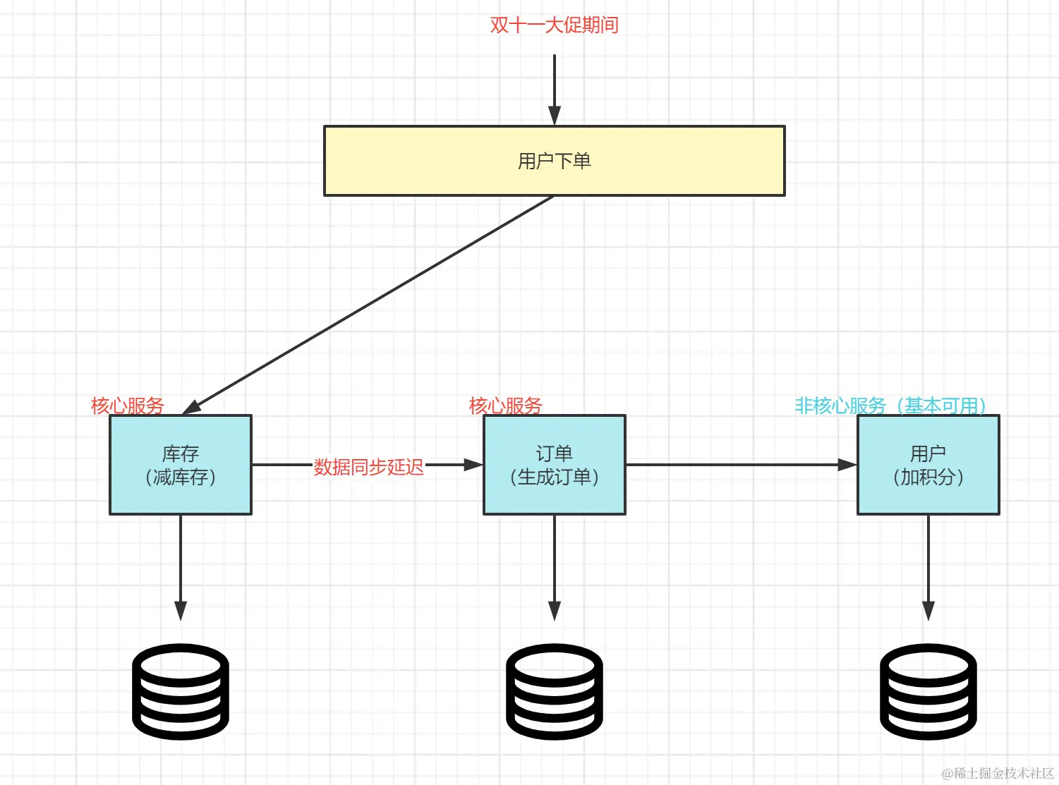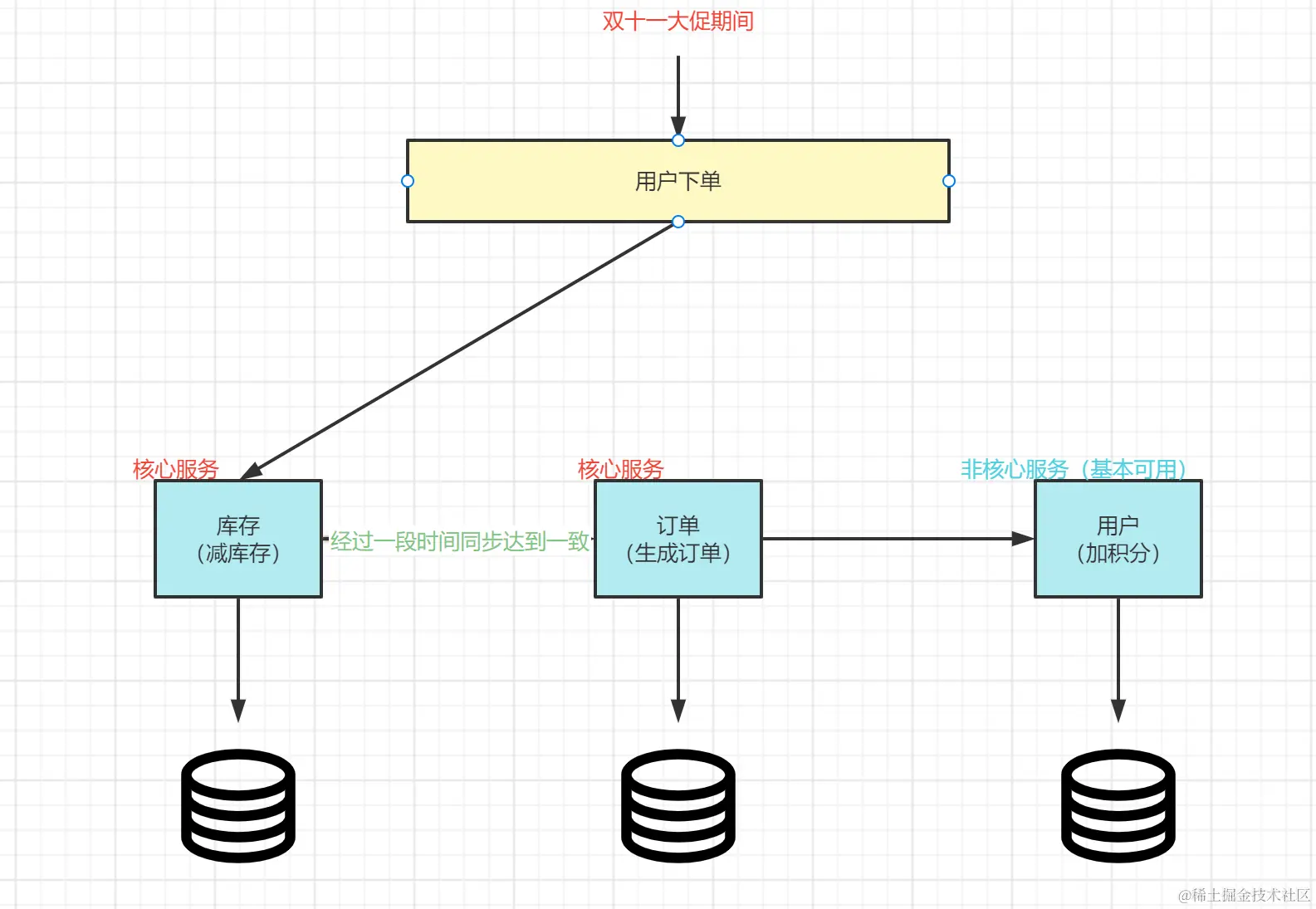 **最终一致性:**再过了流量高峰期以后,经过一段时间的同步,保持各服务数据的一致。