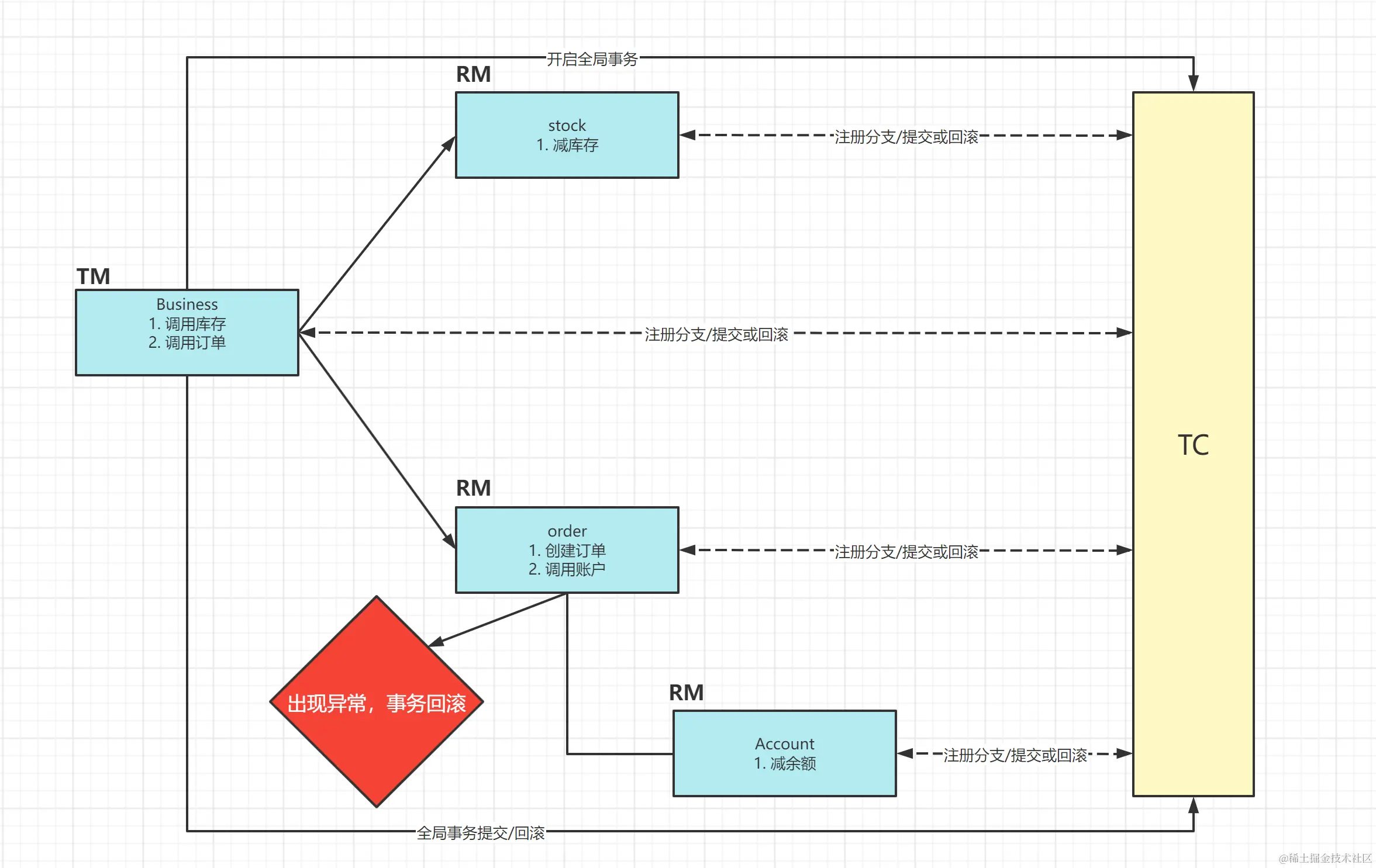 - TM收到执行回复,只要有一方失败则分别向其他RM发送回滚事务,回滚完毕,资源锁释放。