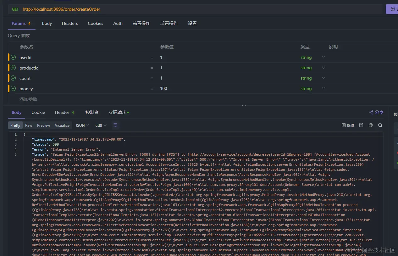 下面使用Seata全部事务注解@GlobalTransactional模拟异常,进行回滚操作。