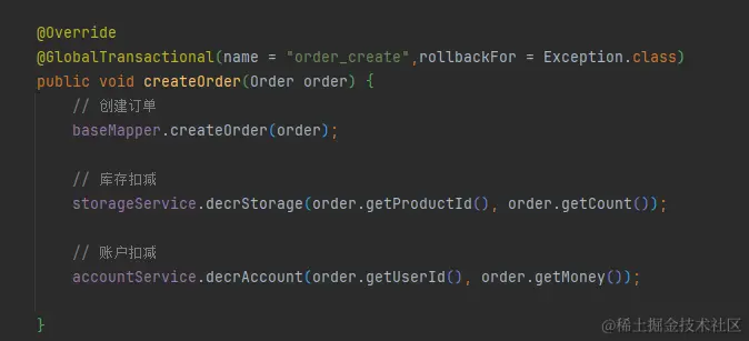 代码修改1:在创建订单createOrder方法上添加注解@GlobalTransactional。