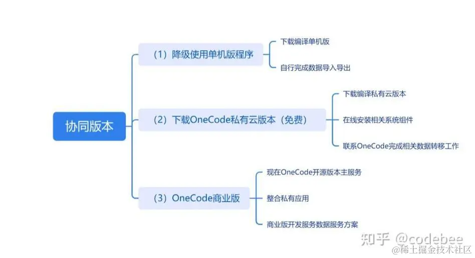 针对于企业协同(多开发者)用户,可以选择降级为单机版继续使用 OneCode 免费服务,但由于单机版中缺少一些协同的组件,暂时还不能支持协同开发。大家仍然需要自己搭建相应的开发和代码管理体系来构建。也可以下载 OneCode 私有云组件(非开源)自行部署私有云服务,或者联系 OneCode 购买商业版本。